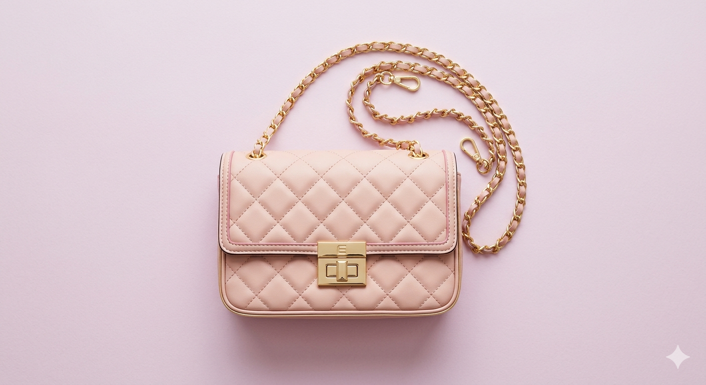 Elegant quilted faux leather sling bag in blush pink, gold chain strap, laid on a pastel backdrop, top-down flat lay, minimalist product photo.