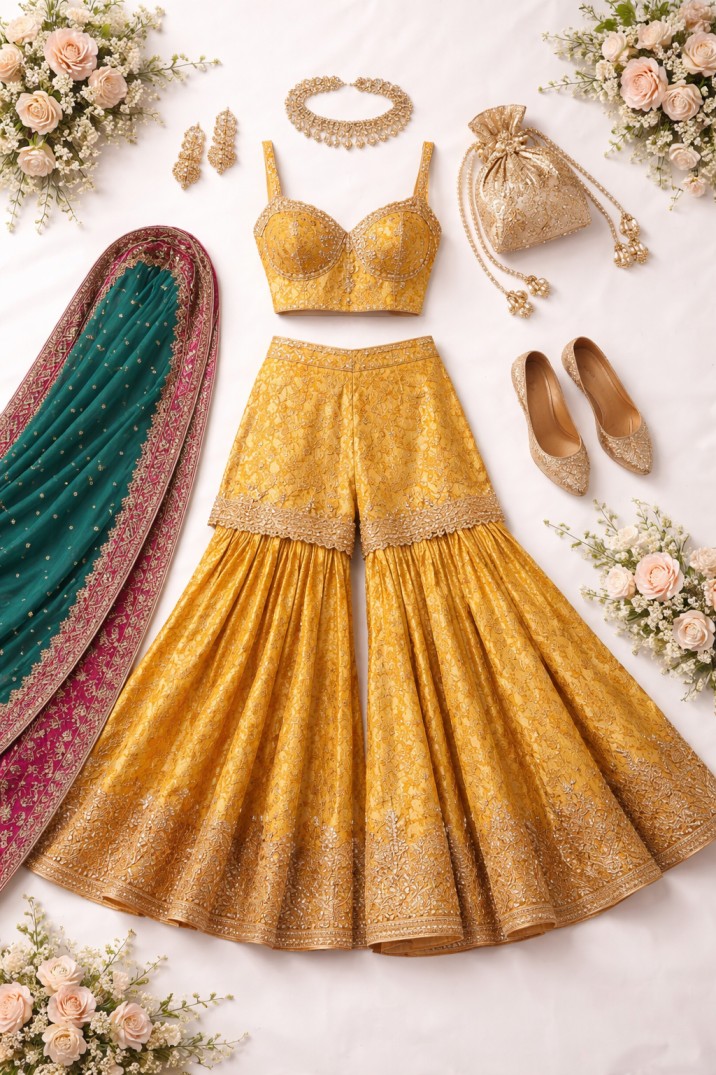 Mustard yellow sharara style lehenga in jacquard fabric with contrast dupatta, full outfit flat lay on white background, fashion photography