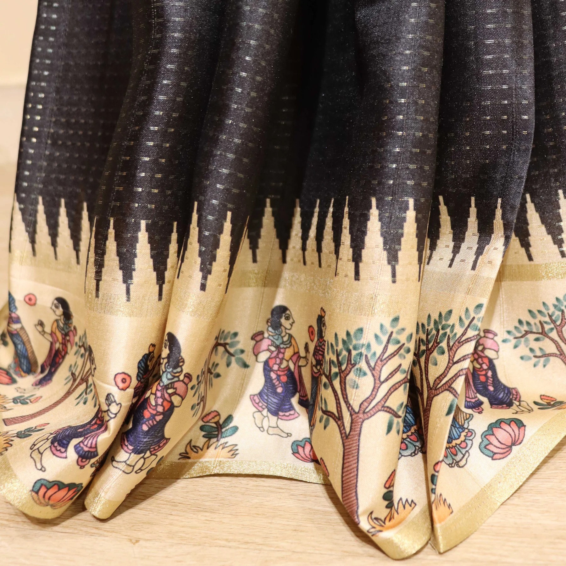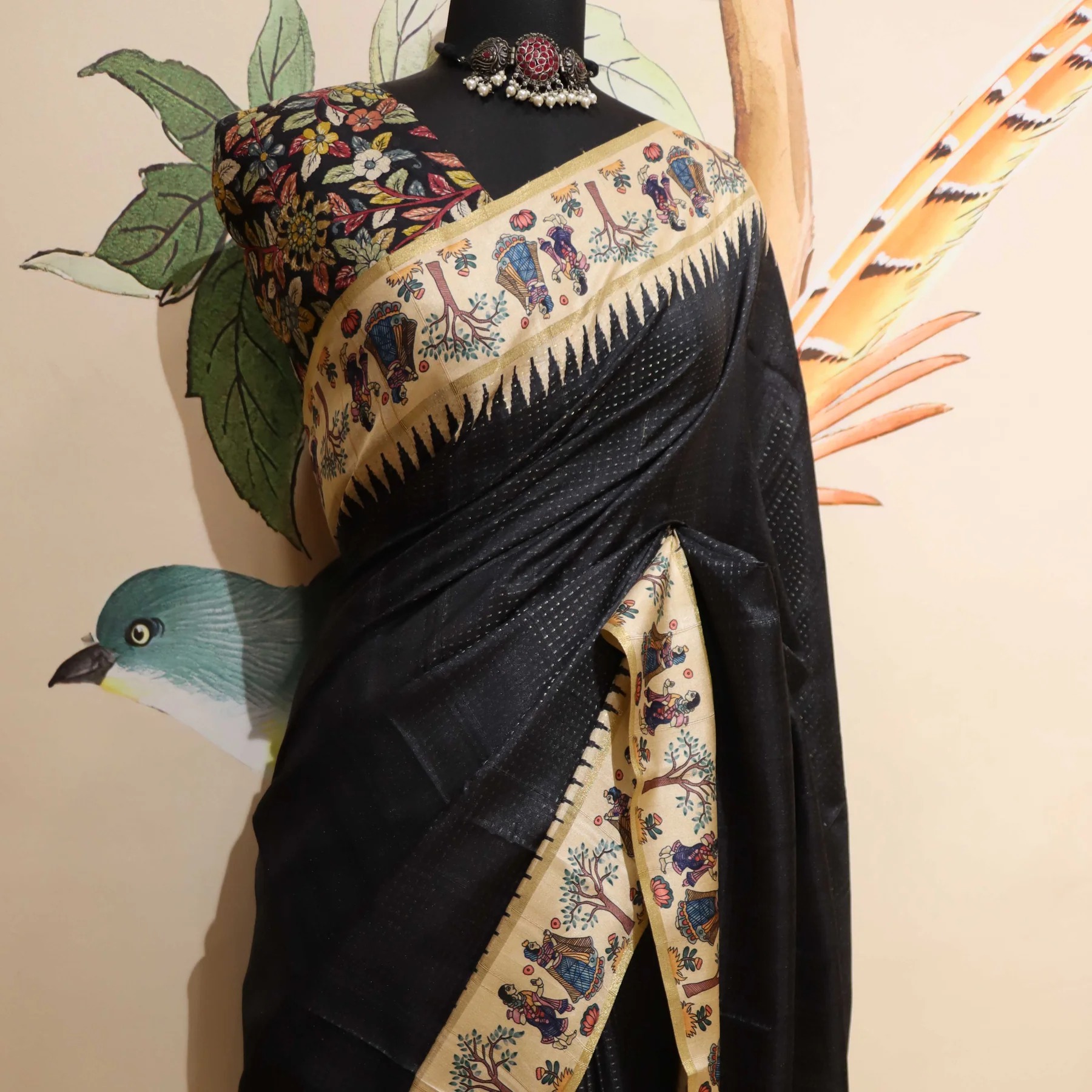 Where bold meets artistic — this striking Black Silk saree with a Kalamkari pallu and border is a masterpiece of Indian folk art fashion. The deep, rich black body with subtle self-texture creates a dramatic canvas, while the wide cream Kalamkari border narrates stories of tradition through intricate Madhubani-style figures, trees and birds. The unique jagged flame-edge transition between the black body and cream border adds an avant-garde graphic element. Paired with a matching Kalamkari floral blouse and oxidized silver jewellery, this is a statement ensemble for the bold, art-loving woman.