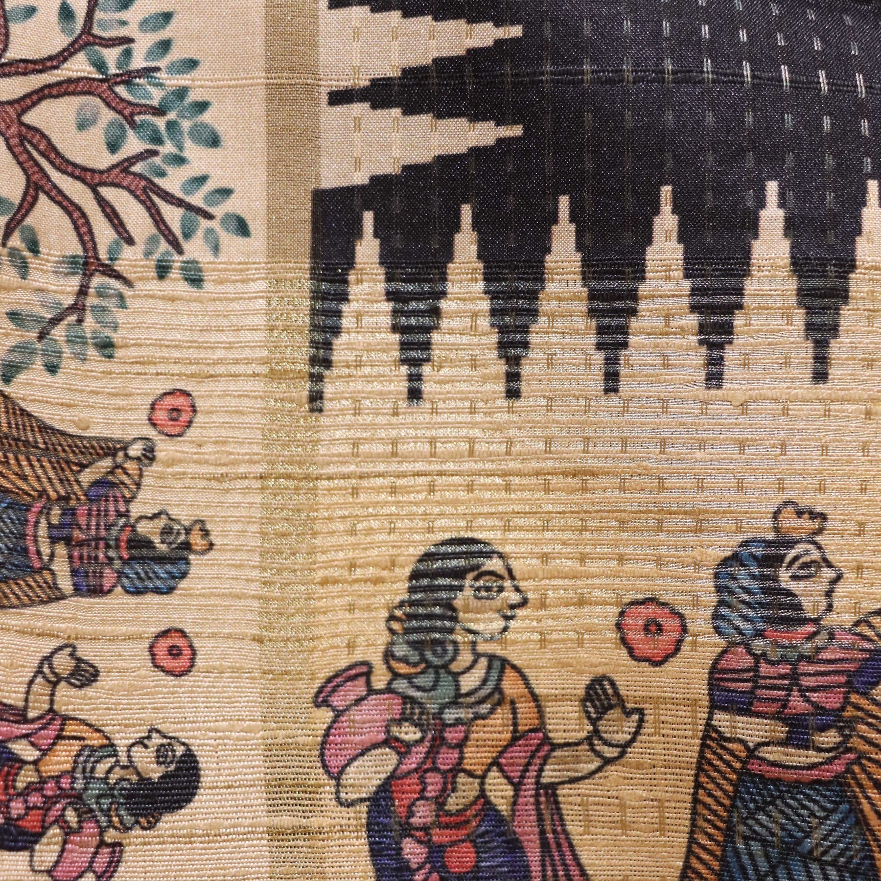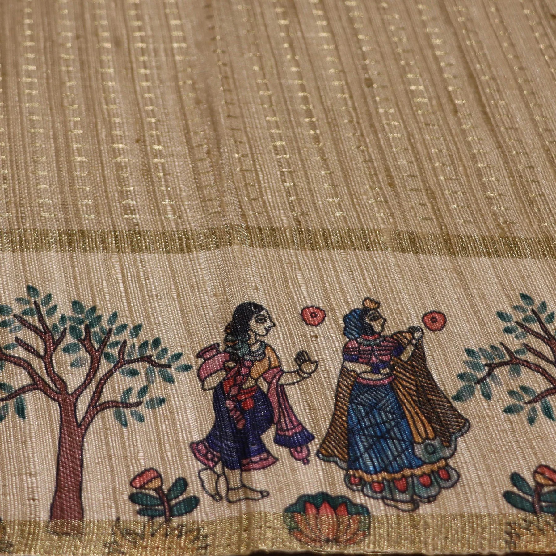 Madhubani figures, trees, birds, folk motifs