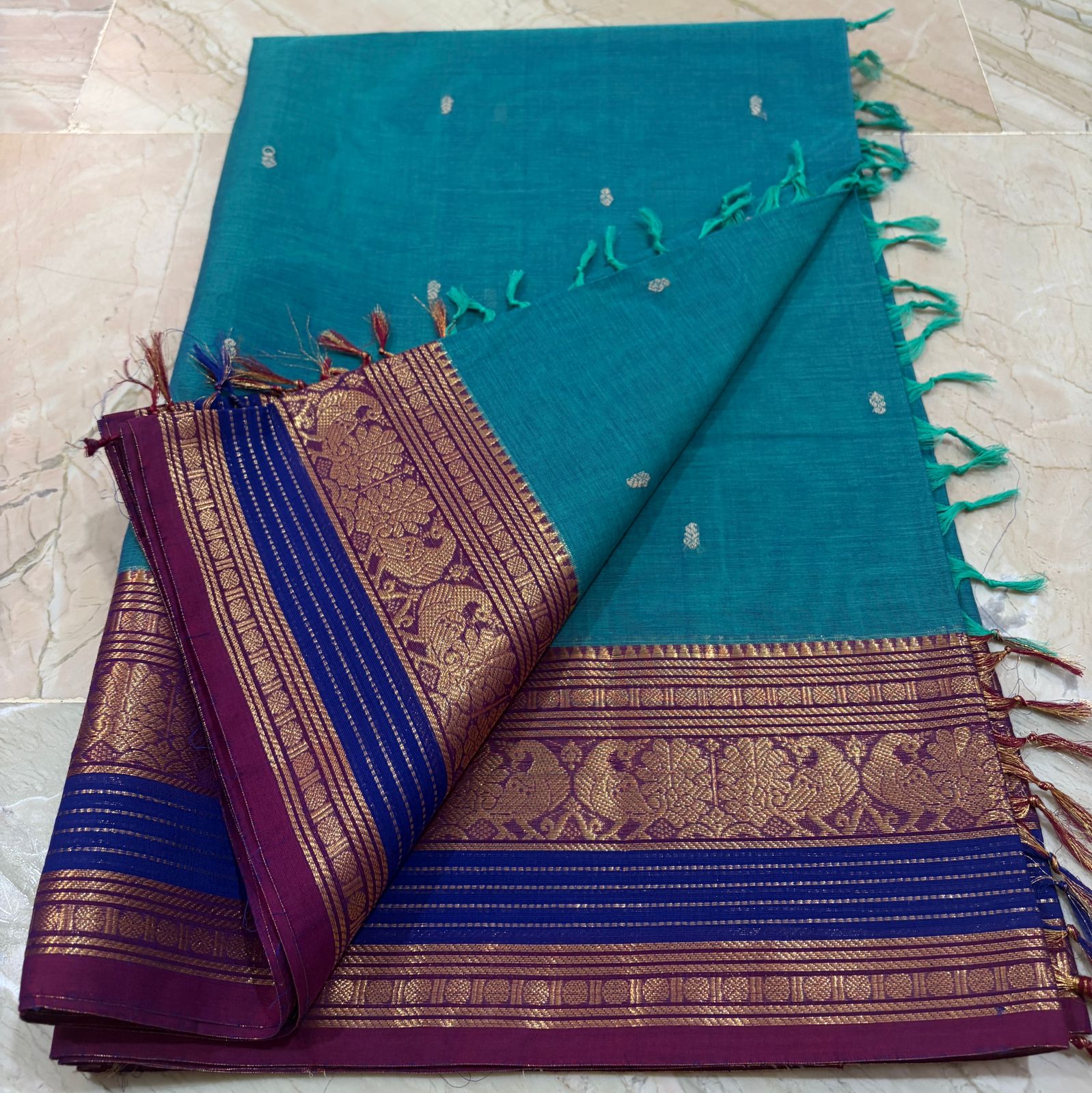 Peacock Teal & Wine Purple Pure Cotton Saree with Heavy Gold Zari Border — Traditional Butta Motifs | Summer Special