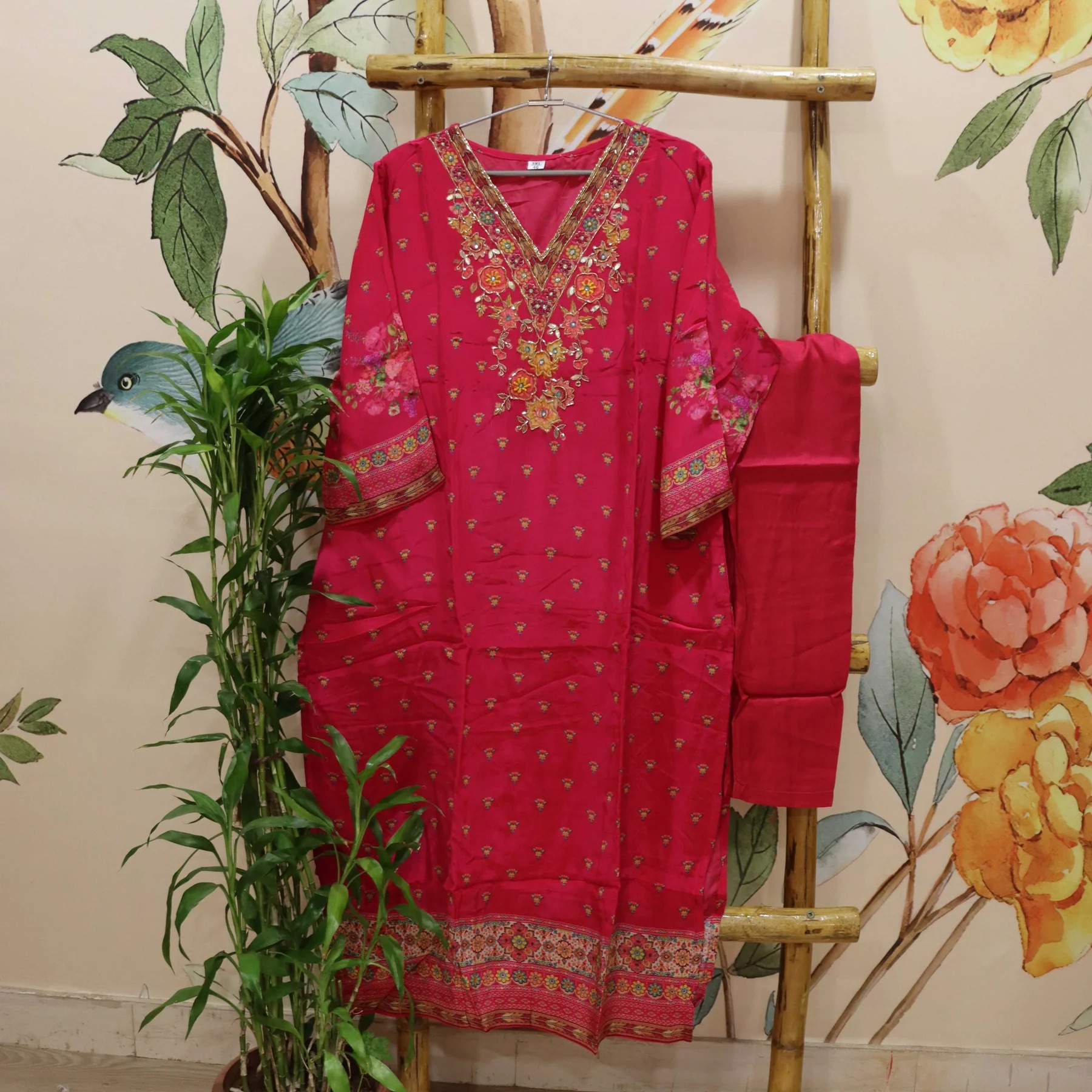 Make a bold and beautiful statement with this vibrant Hot Pink Salwar Suit set — a perfect blend of festive charm and elegant craftsmanship. The rich magenta kurta is adorned with delicate all-over floral booti print, while the V-neckline steals the show with its lavish mirror work, gota patti and multicolor zari embroidery. The ornate printed border at the hem and sleeves adds a regal finishing touch. Paired with a solid deep red salwar, this ready-to-wear set is a celebration of color and tradition — ideal for Eid, weddings, mehndi functions and festive gatherings.